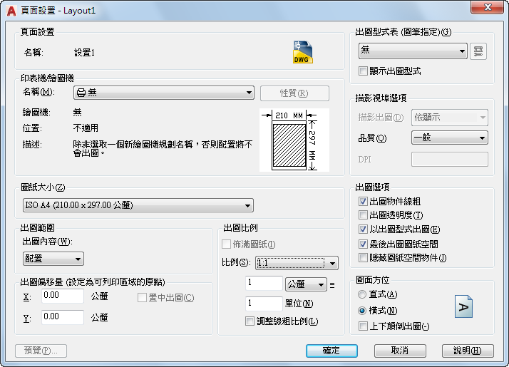 您指定的頁面設置的設定與配置一同儲存,還可以套用到其他配置,或者匯入其他圖面。