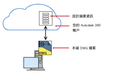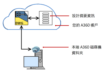 除了將圖檔儲存在 A360 帳戶以外,您也可以將其儲存在本端電腦上的硬碟。在此情況中,這些圖面的設計摘要資料仍儲存在 A360,但與設計摘要資料之間的關聯將透過唯一的設計摘要 ID 維持,此連結會嵌入圖面的設計摘要資料中。