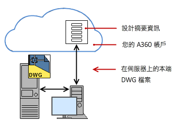 如果您的公司使用網路,透過伺服器管理圖檔將比透過個別電腦管理更為方便。在此情況中,任何擁有 A360 帳戶以及可存取伺服器的使用者,都可以存取與每個圖面相關聯的設計摘要。與將圖面儲存至 A360 帳戶不同,圖面的授權存取只能由伺服器設定的權限進行管理。