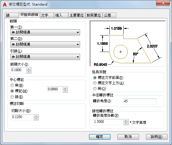 控制直徑標註與徑向標註的中心標記和中心線的外觀。