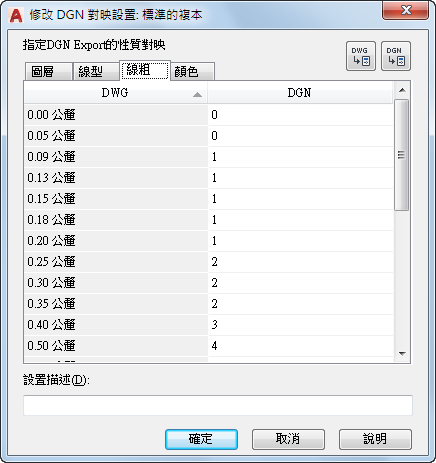 匯出對映設置:如果您已透過從「匯出 DGN 設定」對話方塊中建立新設置來存取「修改 DGN 對映設置」對話方塊,則「DWG」欄將包括目前圖檔中所有已定義的線型。當目標儲存格 (右欄) 為空時,將使用預設系統對映。