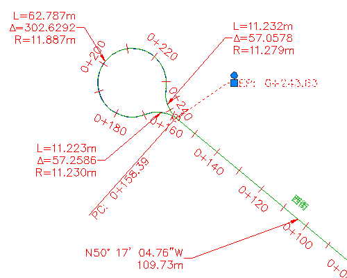 請注意,已選取「主街道」和「東街道」定線及其樁號標示。由於標示於定線所在的外部參考圖面中建立,因此已選取這些標示。透過外部參考建立物件時,則您僅可在來源圖面中編輯該物件的標示。