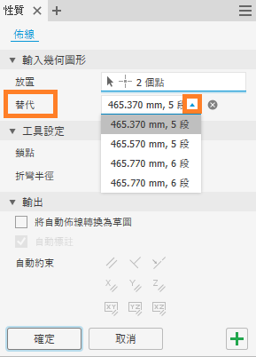 定義末端幾何圖形以建立自動佈線面域後,可以根據段的長度和數目計算出多個解決方案。若要在建立佈線期間顯示可用的替用解法,請按一下「替代」下拉箭頭。