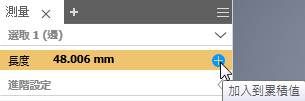 加入多項線性、面積、體積和/或角度測量的值,以計算每種測量類型的總測量值。您可以同時執行多個累積值。