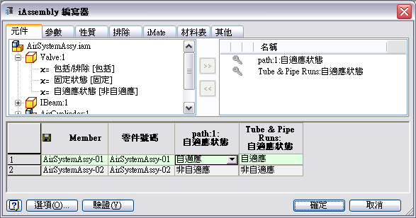 - 完成所有其他 Inventor iAssembly 性質後,按一下「確認」以確認組合規劃。例如,一個主要管路組合成員在 iAssembly 工廠中僅能成為自適應一次,並且「材料表數量」欄僅能包含一個數值或一個字串 Default。