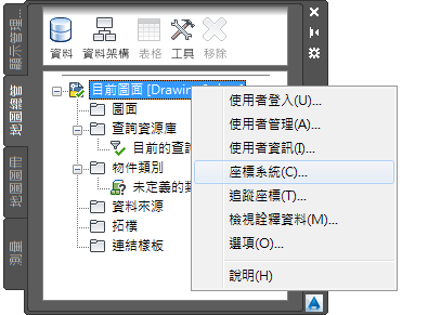 您也可以在目前的圖面上按一下右鍵,以在「地圖總管」中設定地圖的座標系統。