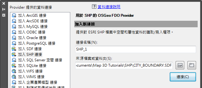 - 在「資料連接」視窗中,於「Provider 提供的資料連接」下 (左側),選取「加入 SHP 連接」。