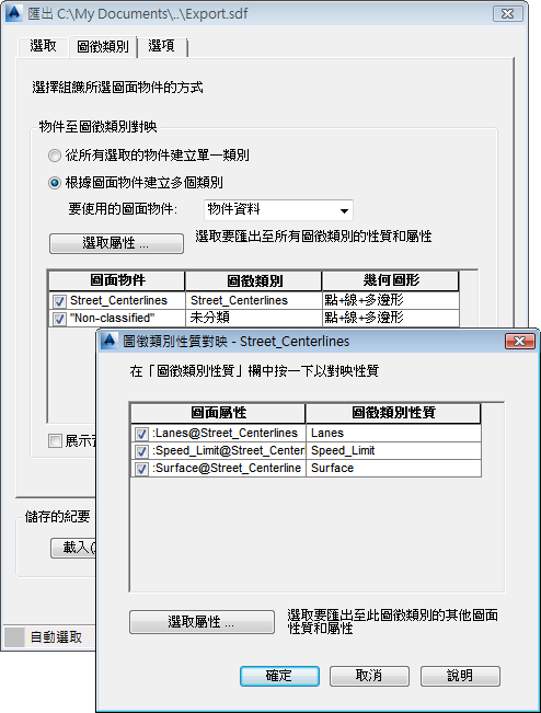 當您匯出圖面物件時,您可以使用物件資料在 SDF 檔案中建立圖徵類別。產生的圖徵類別具有與物件資料屬性相對應的性質。