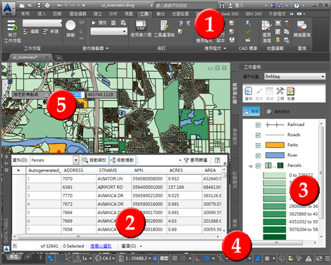 「資料表」和「資料檢視」。以表格形式顯示屬性資料。使用「資料表」檢視空間圖徵的空間資料和屬性資料;使用「資料檢視」檢視連結至圖面物件的屬性資料。使用「表單」編輯在產業模型圖面的個別圖徵的屬性。