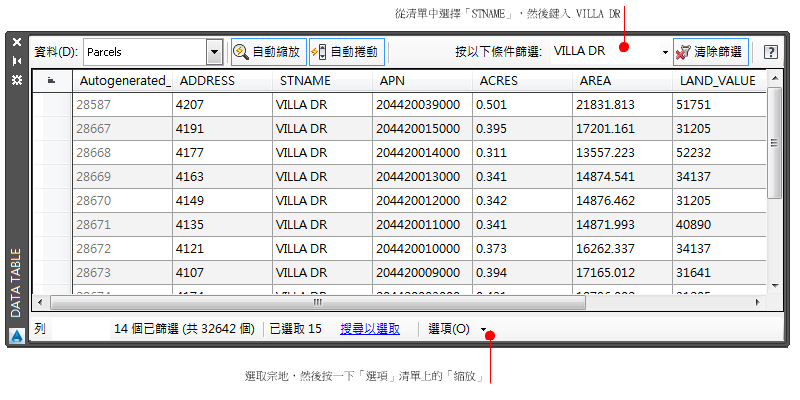 顯示所有圖層的「資料表」。篩選「資料表」以展示宗地的子集 - 在此例中僅為 Villa Drive 上的宗地。