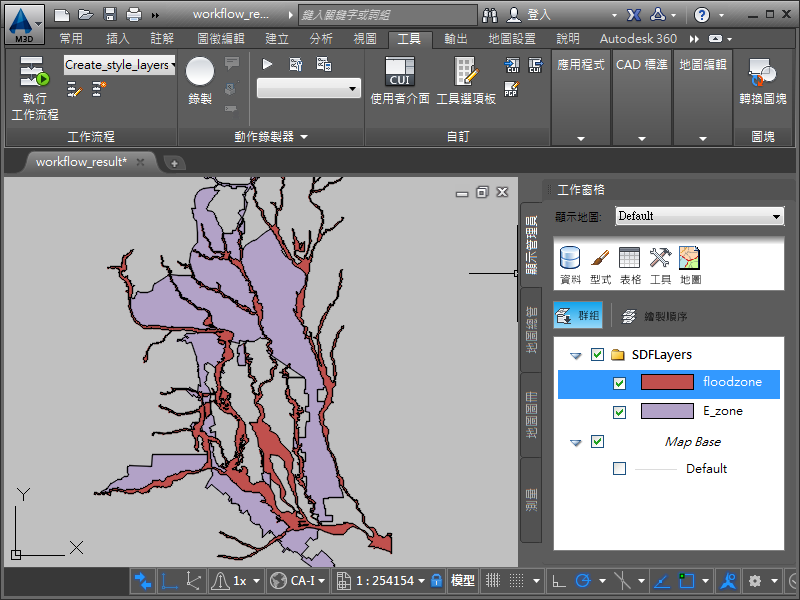 執行工作流程時,AutoCAD Map 3D 會列示指定資料夾中的 SDF 檔案。然後建立一個顯示管理員群組,以容納建立的圖層。它會連接至指定資料夾中的 SDF 檔案。對於指定資料夾中的每個圖面,它會與其連接、將圖層加入至「顯示管理員」,並將圖層移動至新群組。