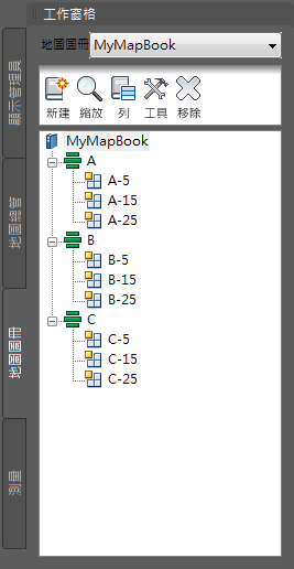 產生地圖圖冊後,會在「工作窗格」中列示地圖框,並會顯示每個地圖框的配置頁籤。