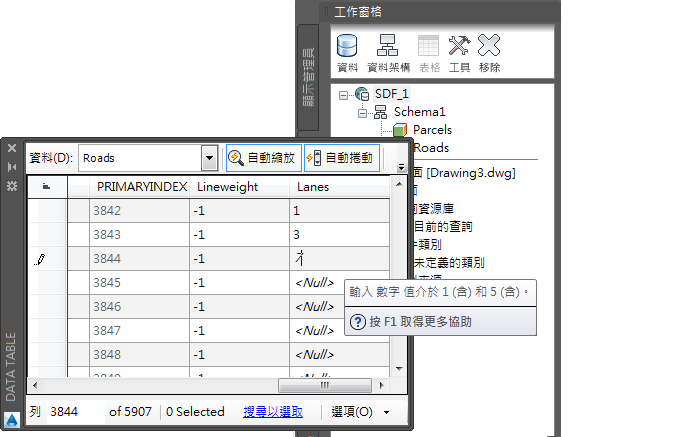 您已連接到之前建立的 SDF 檔案並新增性質到此檔案的資料架構中。您已在「資料表」中輸入了新性質的值。