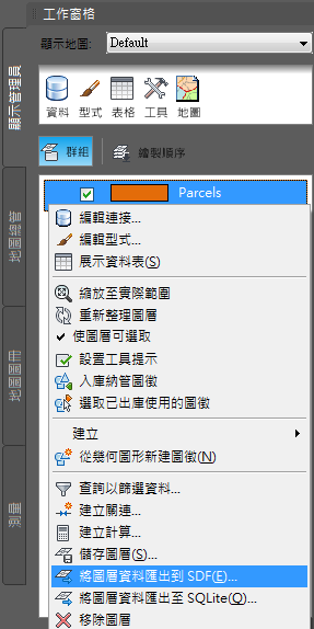 - 在「顯示管理員」中的「Parcels」圖層上按一下右鍵,然後按一下「將圖層資料匯出到 SDF」。