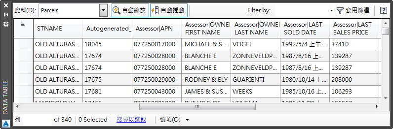 現在,「Parcels」圖層會顯示關連資料。但是,「資料表」中的關連資料呈灰色。灰色文字表示關連的資料不是原始資料倉庫的一部分。您無法對其進行編輯或在計算的性質中使用它