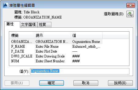 標題欄框定義具有定義其文字和外觀的性質。您可以變更這些性質的值。例如,您可以為指定文字變數的值或圖塊邊界的外觀。