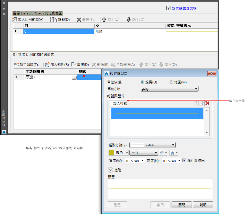 將道路加入至地圖,並建立複合型式以合併兩種線型式,從而形成擬真道路型式。在地圖中拉近至特定的比例範圍時,會顯示複合型式。拉遠時,會顯示較簡單的型式。