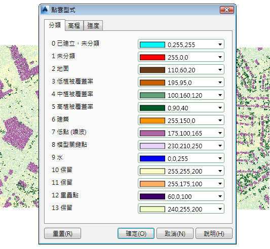 可透過分類、高程、LiDAR 密度和 RGB 值來設定