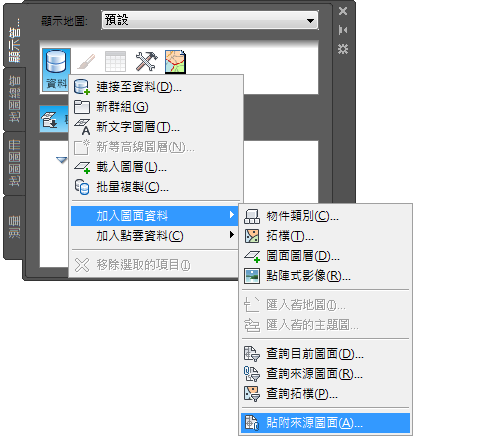 您可以使用「顯示管理員」貼附 AutoCAD 圖檔。