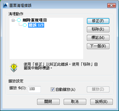 「圖面清理」會找到圖面中的錯誤,並顯示「圖面清理錯誤」對話方塊。對話方塊會依錯誤類型群組錯誤。會亮顯「刪除重複項目」。
