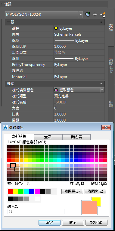 使用「性質」選項板變更「Parcels」物件類別中所有物件的填滿顏色。