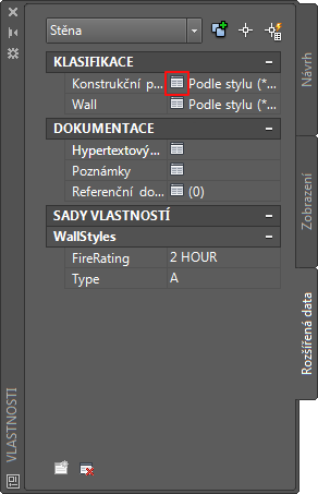 - Na paletě Vlastnosti klikněte na kartu Rozšířená data, v panelu Klasifikace klikněte na položku IFCObjectClassification a vyberte klasifikaci.