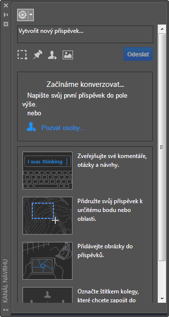 Paleta Kanál návrhu umožňuje prostřednictvím služby Autodesk 360 pro vaše kolegy a klienty publikovat zprávy a odpovědi, které mohou obsahovat připojené obrázky. Zprávy lze propojit s umístěními a oblastmi ve výkresu a mohou k nim online přistupovat osoby, které určíte.