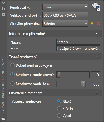 - Název. Určuje název vybrané předvolby rendrování. Přejmenovat lze uživatelskou předvolbu rendrování, ale ne standardní předvolbu rendrování.