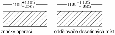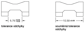 Pokud se hodnota kóty může lišit v obou směrech, jsou vámi zadané kladné a záporné hodnoty přidány k hodnotě kóty jako odchylky tolerancí. Jestliže se hodnoty odchylek tolerancí rovnají, zobrazí se znakem ± a tyto odchylky se nazývají symetrické. Jinak kladná hodnota leží nad zápornou hodnotou.