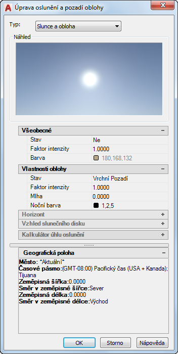 Definuje polohu, barvu a efekty slunce a oblohy v pozadí pohledu.