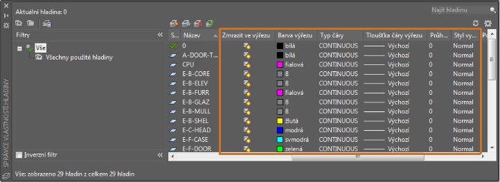 Přepsání vlastnosti hladiny se používají na aktuální výřez rozvržení. Jestliže dvakrát kliknete na výřez rozvržení, aby se stal aktuálním, zobrazí se ve Správci vlastností hladin další sloupce.