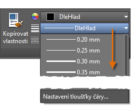 Vlastnost Tloušťka čáry umožňuje zobrazit různé tloušťky vybraných objektů. Tloušťka čar zůstává konstantní bez ohledu na měřítko pohledu. V rozvržení jsou tloušťky čar vždy zobrazeny a tisknuty ve skutečných jednotkách.