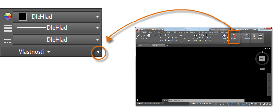 Paleta Vlastnosti je základní nástroj. Je možné ji otevřít pomocí příkazu VLASTNOSTI (v příkazovém okně zadejte zkratku VLA), můžete stisknout kombinaci kláves Ctrl+1, nebo můžete kliknout na malou šipku na panelu Vlastnosti na kartě Výchozí – podle toho, co upřednostňujete.