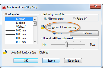 Zobrazení tlouštěk čar můžete ovládat po kliknutí na tlačítko Nastavení tloušťky čáry v dolní části seznamu tlouštěk. V dialogu Nastavení tloušťky čáry můžete zvolit, zda chcete zobrazit nebo skrýt tloušťky čar.