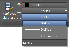 Přerušované čáry a ostatní nesouvislé typy čar jsou přiřazeny z panelu Vlastnosti. Typ čáry je třeba nejprve načíst a teprve potom jej přiřadit.