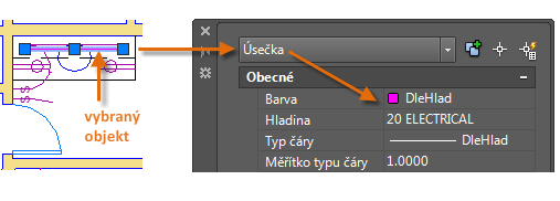 Vlastnost, která je nastavena na hodnotu DLEHLAD, dědí nastavení z hladiny. V předchozím příkladu mají objekty, které byly vytvořeny na hladině 20 ELECTRICAL, nachovou barvu, protože se jedná o výchozí barvu objektů na této hladině.
