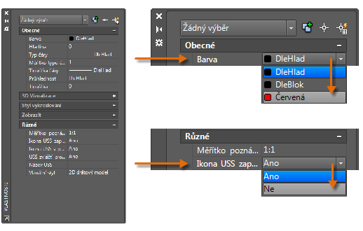 Na paletě Vlastnosti se zobrazuje seznam všech důležitých nastavení vlastností. Kliknutím na libovolné z dostupných polí můžete změnit aktuální nastavení. Pokud nejsou v následujícím příkladu vybrány žádné objekty, změní se nastavení aktuální barvy z možnosti DleHlad na možnost Červená a ikona USS bude vypnuta.