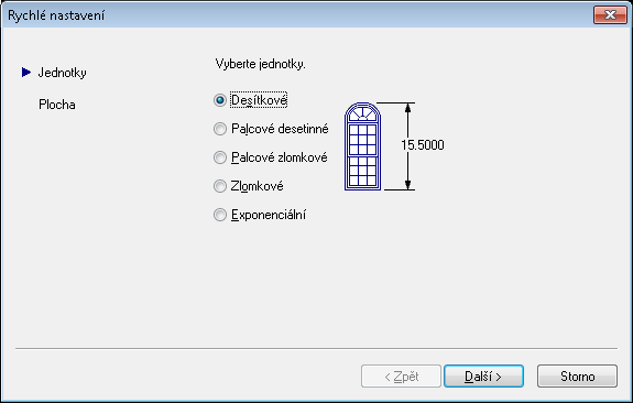 Průvodce Rychlé nastavení má dva dialogy: Jednotky a Plocha. Při práci v průvodci lze pomocí tlačítek Zpět a Další přepínat mezi stránkami; kliknutím na Dokončit na poslední stránce uzavřete průvodce a vytvoříte nový výkres se zadanými nastaveními.