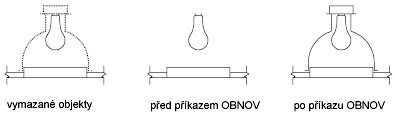 Příkaz OBNOV můžete použít také po příkazu BLOK nebo PIŠBLOK, protože tyto příkazy mohou po vytvoření bloku vymazat vybrané objekty.