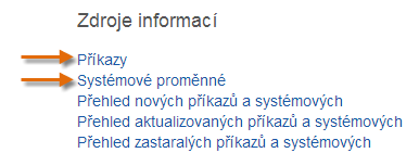 Stisknutím klávesy F1 otevřete nápovědu. Na domovské stránce nápovědy klikněte na odkaz Příkazy nebo Systémové proměnné.