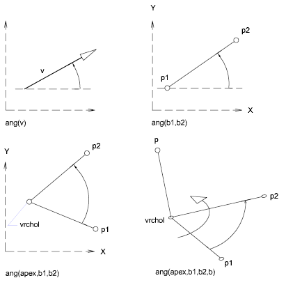 Funkce ang měří úhel mezi dvěmi úsečkami. Úhly se měří proti směru hodinových ručiček, buď vzhledem k ose X v případě 2D, nebo vzhledem k ose zadané uživatelem v případě 3D.