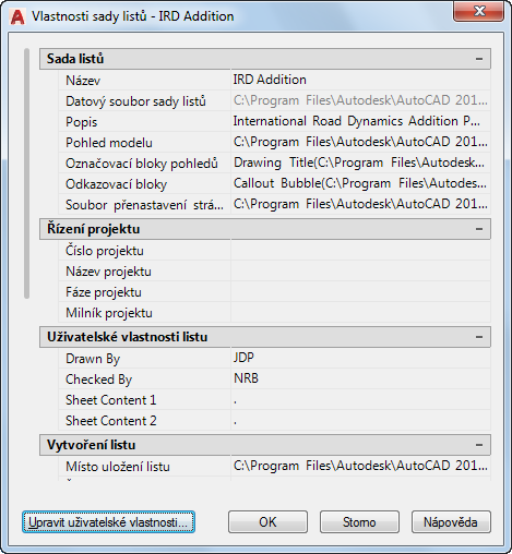 Jedná se o informace, například cesta a název datového souboru sady listů (DST), cesty složek, které obsahují výkresové soubory asociované se sadou listů, a libovolné uživatelské vlastnosti asociované se sadou listů
