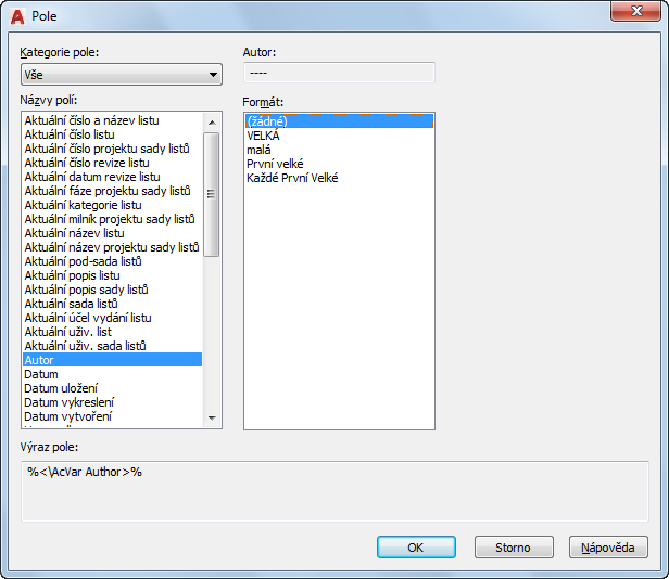 Pokud je v seznamu Názvy polí vybrána položka Pojmenovaný objekt, vypíše názvy všech objektů vybraného typu ve výkresu. Pokud je v seznamu Názvy polí vybrána položka Objekty, zobrazí se vlastnosti vybraného objektu, které jsou dostupné jako pole. Jsou-li vybrány bloky s atributy, zobrazí se v seznamu vlastností názvy atributů.