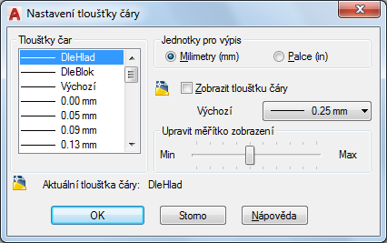 Nastaví aktuální tloušťku čáry a jednotky tloušťky čáry, řídí zobrazení a měřítko zobrazení tlouštěk čar a nastaví VÝCHOZÍ hodnotu tloušťky čáry pro hladiny.