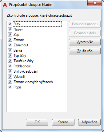 Určuje, které sloupce budou zobrazeny ve Správci vlastností hladiny pro aktuální kartu Model nebo kartu rozvržení.