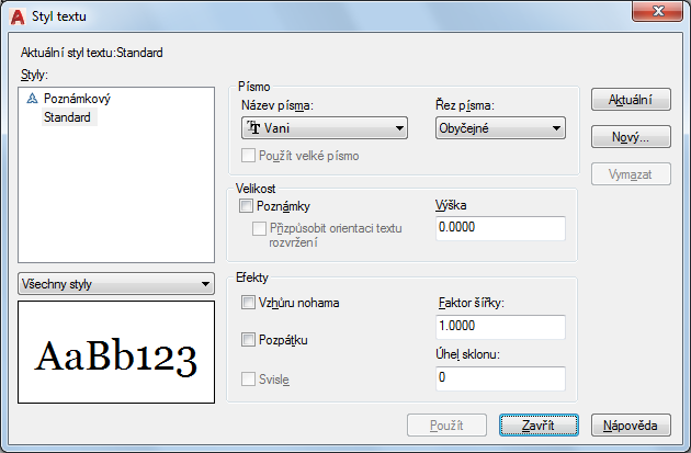 Nastaví výšku textu podle hodnoty, kterou zadáte. Zadáním výšky větší než 0.0 se automaticky nastaví výška textu pro tento styl. Zadáte-li hodnotu 0.0, bude použita výchozí výška shodná s naposledy použitou výškou textu nebo hodnota uložená v souboru šablony výkresu.