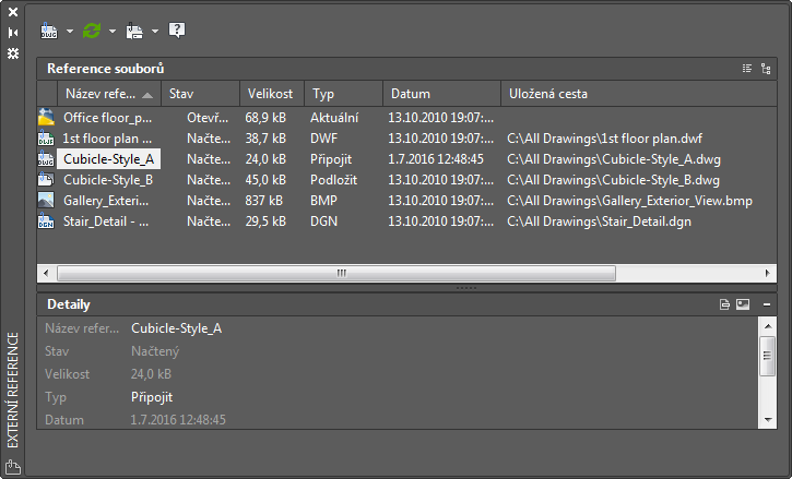 Paleta Externí reference slouží k uspořádání, zobrazení a správě odkazovaných souborů, například souborů DWG (externí referencí), DWF, DWFx, PDF, podložení DGN, rastrových obrázků, mračen bodů (soubory RCP a RCS) a modelů koordinace (soubory NWD a NWC).