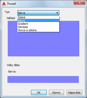 Zobrazuje seznam předefinování pozadí (Žádné, Barva, Gradient, Obrázek nebo Slunce a obloha), které je možno použít pro pojmenovaný pohled.