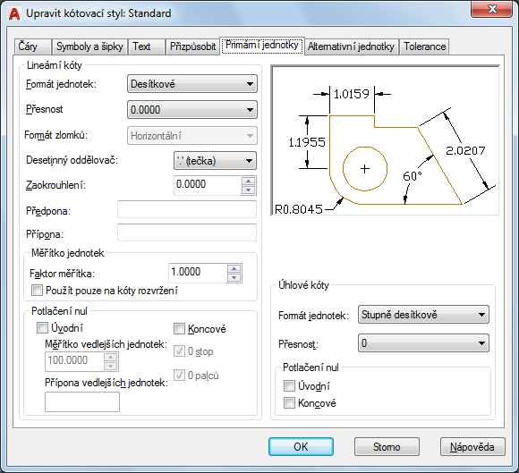 Nastavuje formát a přesnost primárních kótovacích jednotek a nastavuje předpony a přípony kótovacího textu.