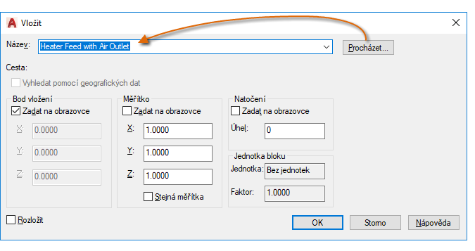 Po vložení je definice bloku uložena v aktuálním výkresu. Od této chvíle je možné ho vybrat v rozevíracím seznamu Název, aniž by bylo nutné kliknout na tlačítko Procházet.